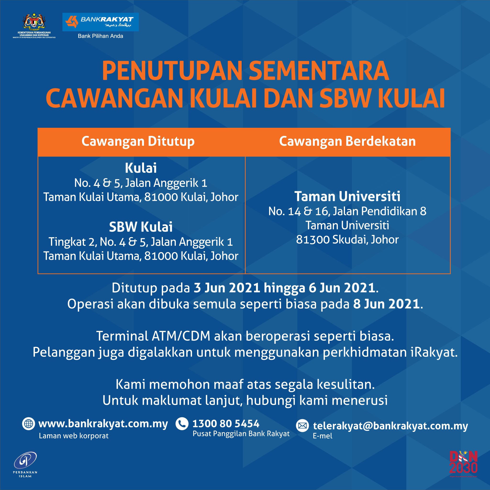 Bank Rakyat On Twitter Pelanggan Yang Dihargai Sila Ambil Maklum Berkaitan Penutupan Sementara Cawangan Kulai Dan Sbw Kulai Pada 3 Jun 2021 Hingga 6 Jun 2021 Operasi Akan Dibuka Semula Pada 8
